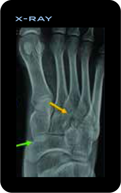 On the standard X-ray there is a line that can be suspected of being a nondisplaced fracture. The base of the medial cuneiform is obscured by the navicular on the X-ray and is better seen on Nanox.ARC.